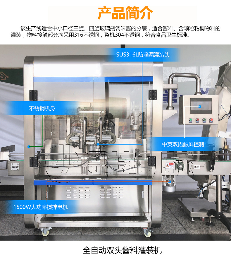 該生產線適合中小口徑三旋、四旋玻璃瓶調味醬的分裝,適合醬料、含顆粒黏稠物料的灌裝,物料接觸部分均采用316不銹鋼