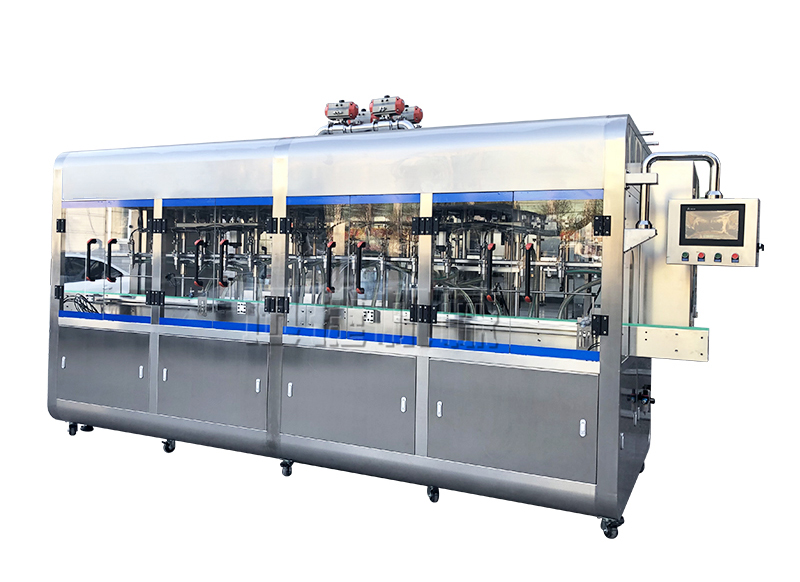 灌裝機儲油箱部分與灌裝機連接法蘭保持原位置,避免沖洗,避免雜質進入;儲油箱容積≥600KG,內部設有阻擋板,避免油品輸入過程油品外冒,同時保證灌裝精度;儲油箱位置設在灌裝機頂部,自帶可視液位計,頂部箱蓋大包圍設計并且可以打開,具備排氣功能(排出氣泡等);灌裝頭整體上升方式平穩,不產生震動,高度及寬度可調。