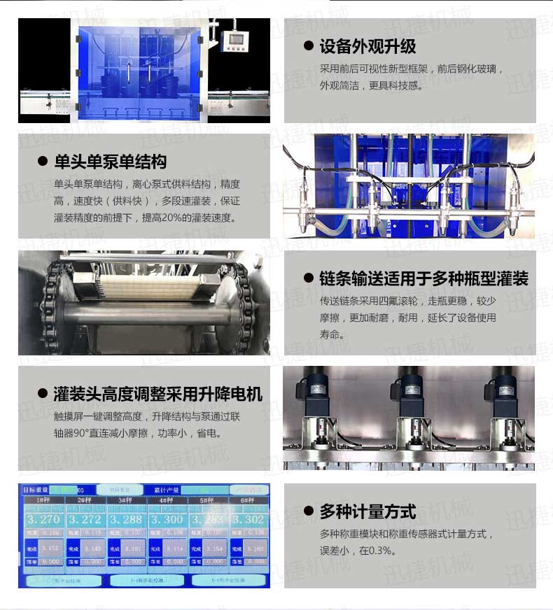 機油灌裝機適用于對4kg-25kg汽車用品類產品:潤滑油、防凍液、車用尿素等液體灌裝。自動完成計數進瓶、計重量灌裝、輸送出瓶等一系列操作。