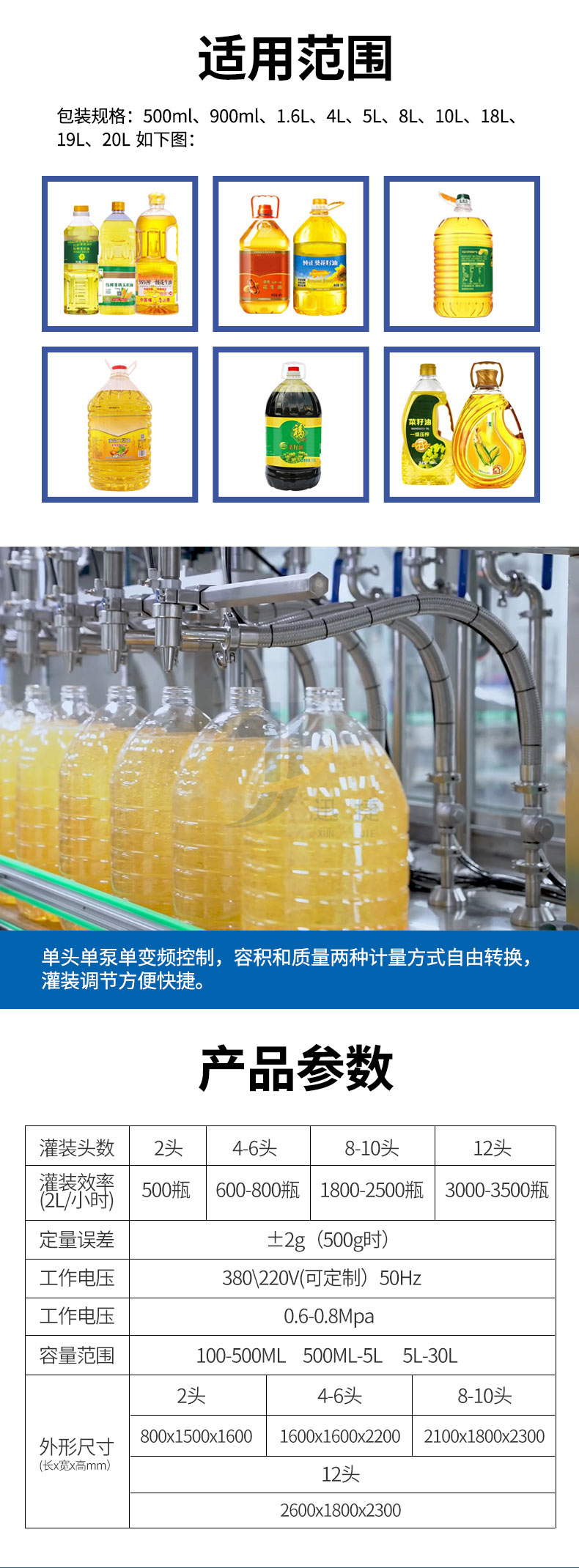 全自動(dòng)八頭食用油灌裝機(jī)單頭單泵單變頻控制,容積和質(zhì)量?jī)煞N計(jì)量方式自由轉(zhuǎn)換,灌裝調(diào)節(jié)方便快捷。